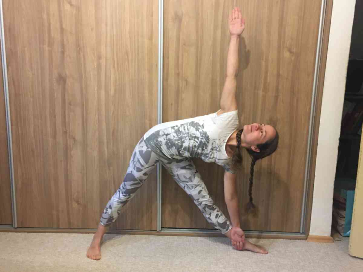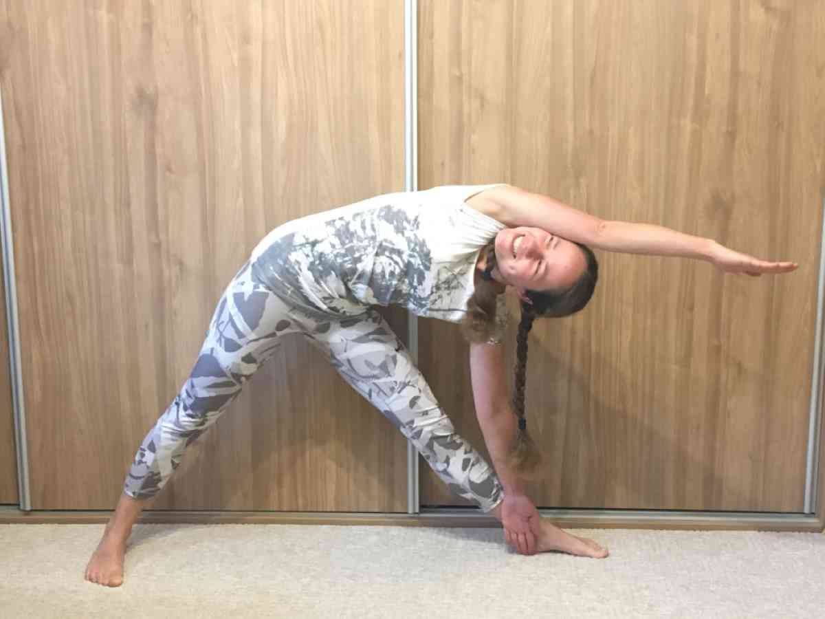 3. fáze – Protáhněte ruku podél ucha ve směru natažení celé strany trupu. Chodidla stahujte pocitově k sobě, tím zabezpečíte kolenní klouby, do kterých nebude přenesena váha. Jakmile budete ukloněni, zatlačte v zádech do pomyslné stěny za sebou. Nadechněte se, opět prodlužte páteř a s výdechem se soustřeďte na uvolnění. Zůstaňte na 5 nádechů a výdechů a opakujte na druhou stranu.