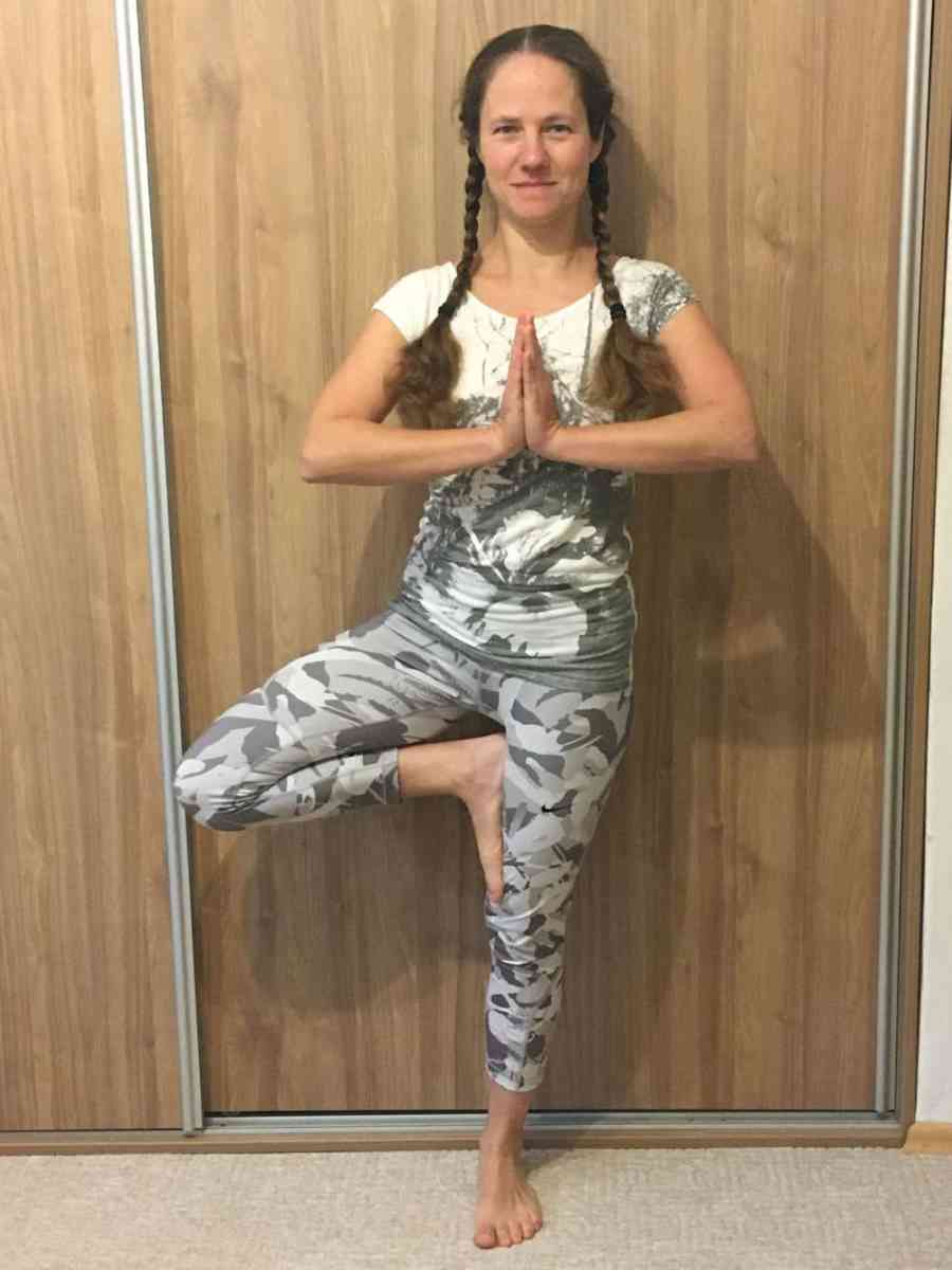 Vrkšásana neboli pozice stromu je ideální k tréninku rovnováhy, Uthita-trikonasana neboli trojúhelník na protažení.