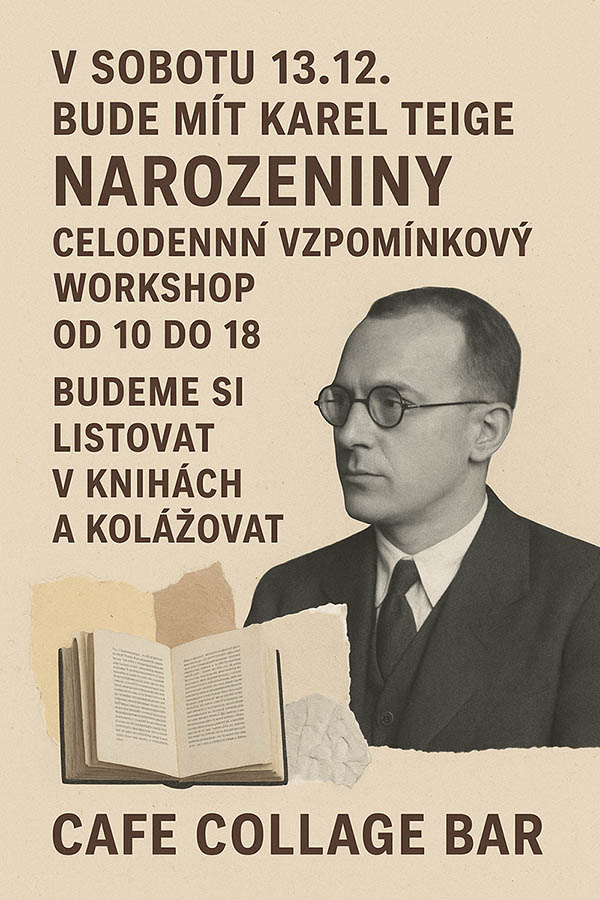 Am Samstag, den 13. Dezember, verwandelt sich die Café Collage Bar in ein Winteratelier – einen ganztägigen Gedenktag anlässlich des 125. Geburtstags von Karel Teige, einer Schlüsselfigur der tschechischen Avantgarde, Kunsttheoretiker, Typograf und einer der bedeutendsten Collageschaffenden des Landes. Teige (1900-1951) war nicht nur Mitbegründer der tschechischen Avantgarde-Künstlergruppe der 1920er Jahre Devětsil und die Stimme des Poetismus, sondern auch ein Künstler, der visuellen Rhythmus, Wort und Bild zu einer neuen Sprache der Moderne vereinte. Seine Collagen inspirieren bis heute durch ihre Präzision, Verspieltheit und intellektuelle Tiefe.