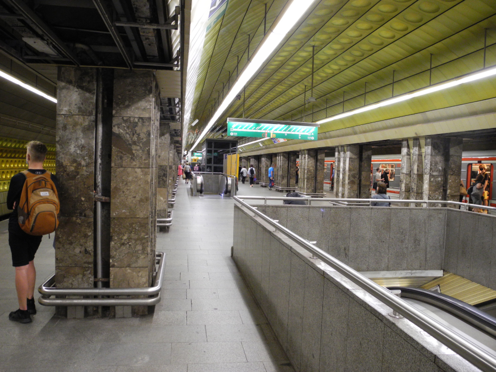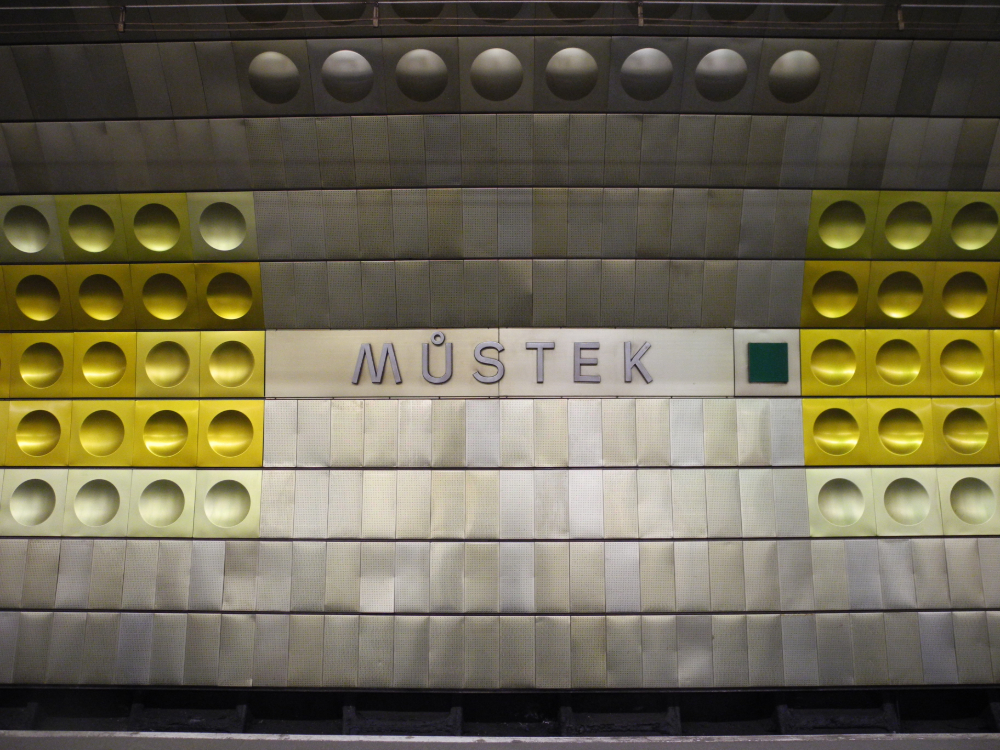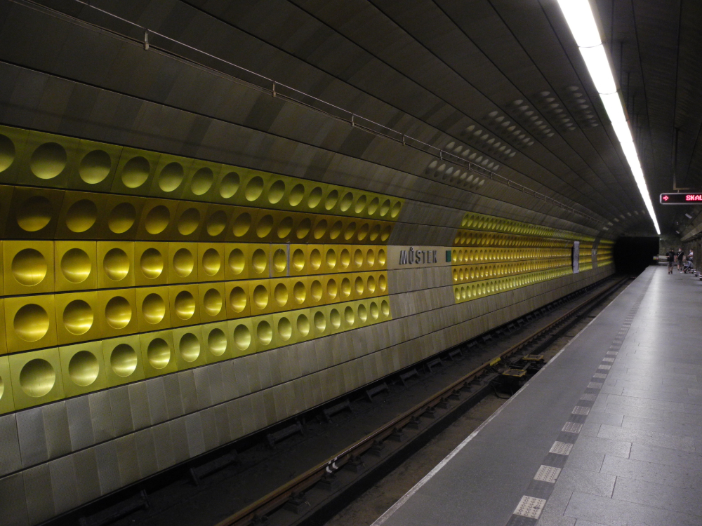 Nástupiště stanice Můstek s atypickými champagne pásy.