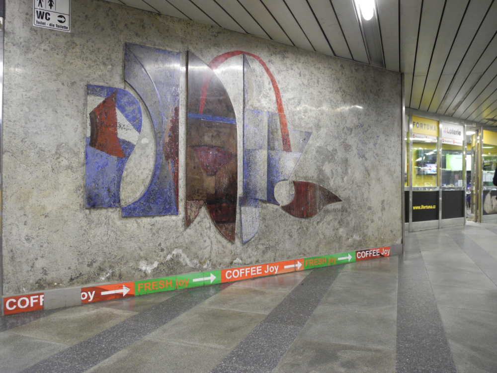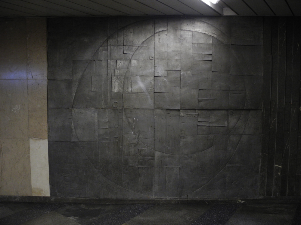 Nástěnná plastika L. Dydka a F. Bílka ve vestibulu stanice.