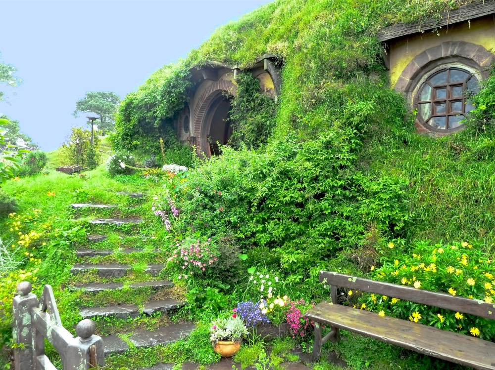 Nachází se v blízkosti města Matamata. 500 hektarů fascinující kopcovité přírody s rybníky, úžasnými výhledy a třiceti tisíci ovcemi, naprosto odstřihnuté od světa. To bylo to správné místo, které si již v roce 2000 Peter Jackson vybral pro natáčení trilogie Pán prstenů. Téměř rok se tehdy stavěly kulisy a nechala se vyrůst obrovská zelenina, ovoce a květiny, které tam jsou dodnes. „Nic nejezte ani nechutnejte,“ prosí nás naše usměvavá průvodkyně. „Vše tady narostlo pomocí chemických hnojiv.“ Při samotném natáčení se v okolí muselo na dobu tří měsíců zajistit ubytování pro 400 účastníků filmu a na louce ve stanech i jejich každodenní stravování (vždy dva chody). Ale film měl úspěch — jeho rozpočet činil 700 milionů dolarů, utratilo se 900 milionů — film Pán prstenů nakonec „nahrál“ neuvěřitelné 4,4 miliardy dolarů. Po natáčení měly být všechny kulisy zrušeny, avšak silný hurikán práce na demolici přerušil. Naštěstí.