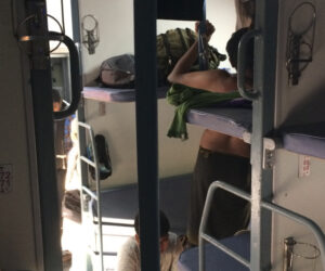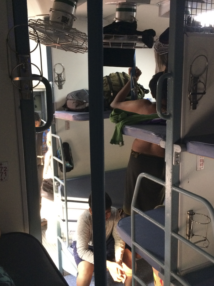 Právě jsem nastoupila do „rychlíku“ s tempem osobního vlaku. Přijel o hodinu déle, než bylo v plánu, ale to je na místní poměry vynikající čas. Dveře zde neexistuji, vagóny jsou vysoké, protože z každé sedačky lze vytvořit zároveň ležení, celkem tři patra, tři větráky, zrcátko a mříže na oknech. Cestující jsou různí, ale všichni mají bosé nohy, někteří žabky, které stále nazouvají a vyzouvají. Vlakem jede také mnoho poutníků, kteří se vydávají na různě dlouhou cestu a žijí z milodarů. Právě se dívám na jednu rodinku – pouze muži, kteří na takové cestě jsou a momentálně se převlékají do jinak barevného parea kvůli modlitbě. Ze směsi popele, koření a barev si kreslí třetí oko na čelo a k tomu z oken suší mokré oblečení, které si ve vlaku přeprali. Možná kvůli tomu mají okna mříže. Nejmladší z nich — ve věku přibližně 10 let — vytahuje po modlitbě, ukončené točením v kroužku a dotecích střídavě rukou na zem a čelo, chipsy a láduje se z velkého zeleného pytlíku, který pravděpodobně za chvíli poletí místo do koše, který zde stejně není, z okna. Smažené brambůrky tady zkrátka fungují stejně tak masivně jako v Británii či Americe. Je téměř poledne. Cestující postupně začínají otevírat krabičky a pravou rukou formují sousta z rýže, kterou namáčí do různě barevné omáčky. Nejrůznější vůně se linou vlakem a mísí se s neidentifikovatelnými odéry z venčí. Mezitím uličkou prochází „nabídka“ kávy, smažených koblih, ořechů, výherních losů, ale i žádostí o peníze v podobě slepce či beznohého Inda vytírajícího svým pozadím podlahu. Na „chodbě“ je velké umyvadlo. Všichni si k němu po jídle chodí mýt ruce a zároveň si prstem před zrcadlem očišťují zuby. Poutníci u něho perou svých pár kousků oblečení. Vůbec se nemohu soustředit na čtení, kolik mám dojmů. Ležím totiž v prvním patře se skvělým výhledem. Postupně mi dochází, jak odlišný je to svět od toho našeho – evropského. Baví mě, že si zde lidé naplňují životy také něčím jiným, než prací. Na špičce pomyslného žebříčku hodnot mají totiž rodinu, víru a tradice.